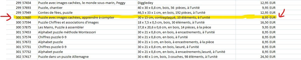 Tout à fait à gauche, vous repérez le n° de page, puis le n° de l'article : dans notre exemple ci dessous, vous pouvez consulter le prix du puzzle vu page 300, dont le n° est 57480...